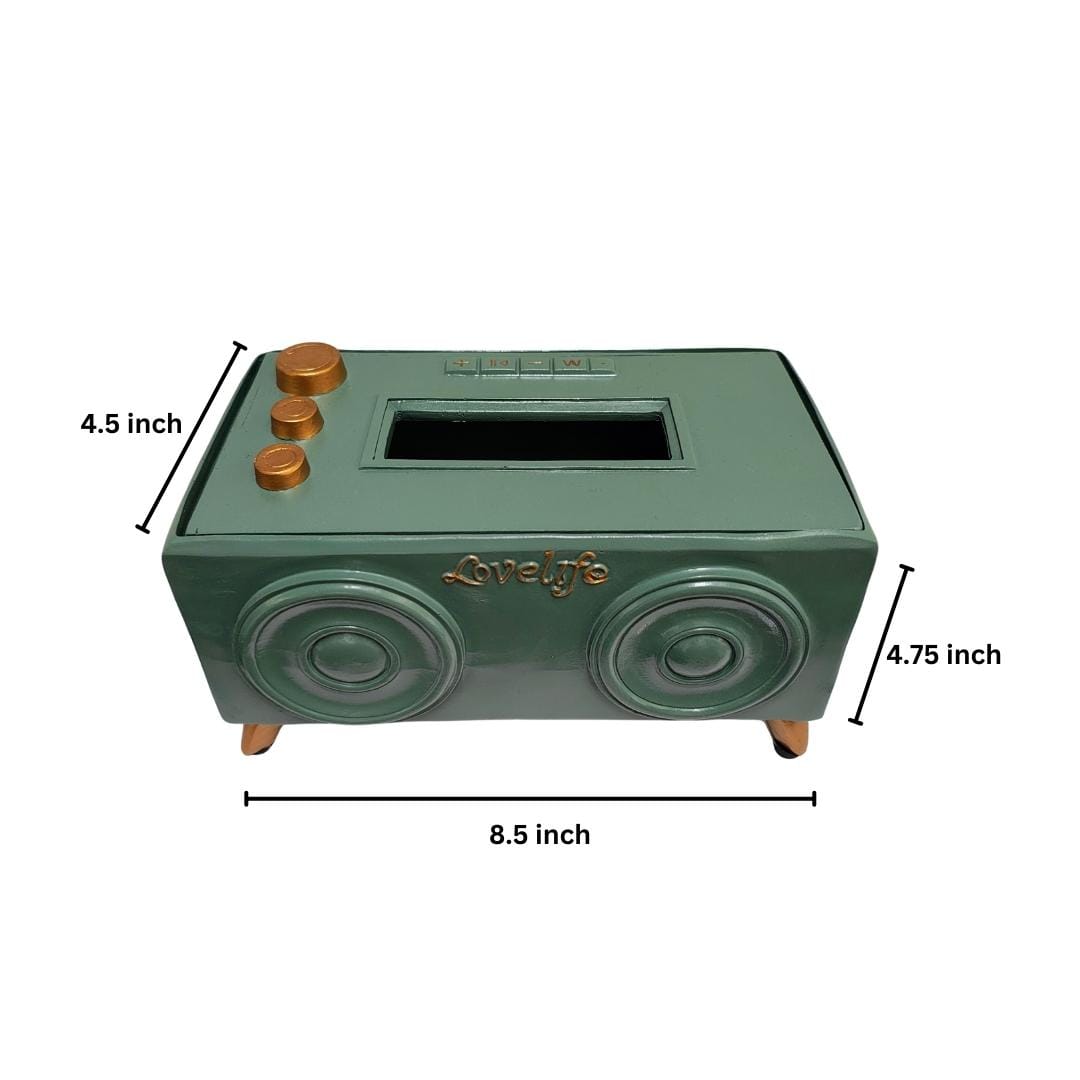 This exquisite tissue holder is crafted from durable polyresin, designed to emulate the appearance of an antique music speaker. Its vintage aesthetic not only serves a functional purpose but also adds a charming decorative touch to any room.