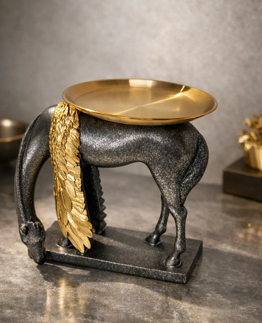 Add a unique blend of art and functionality to your décor with this Artistic Horse Tray Showpiece. Crafted from durable polyresin with elegant detailing, the sculpture features a beautifully designed horse form complemented by a metal plate placed on the back, creating a stylish decorative tray.