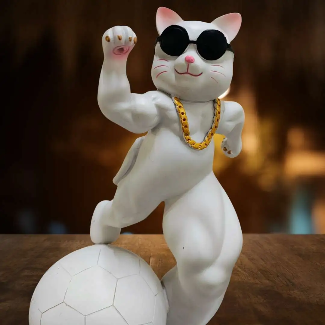 The cat is dynamically positioned with one foot grounded and the other playfully kicking a football, capturing an action-packed moment. This artifact perfectly reflects a blend of humor and artistry for both collectors and casual decorators alike.