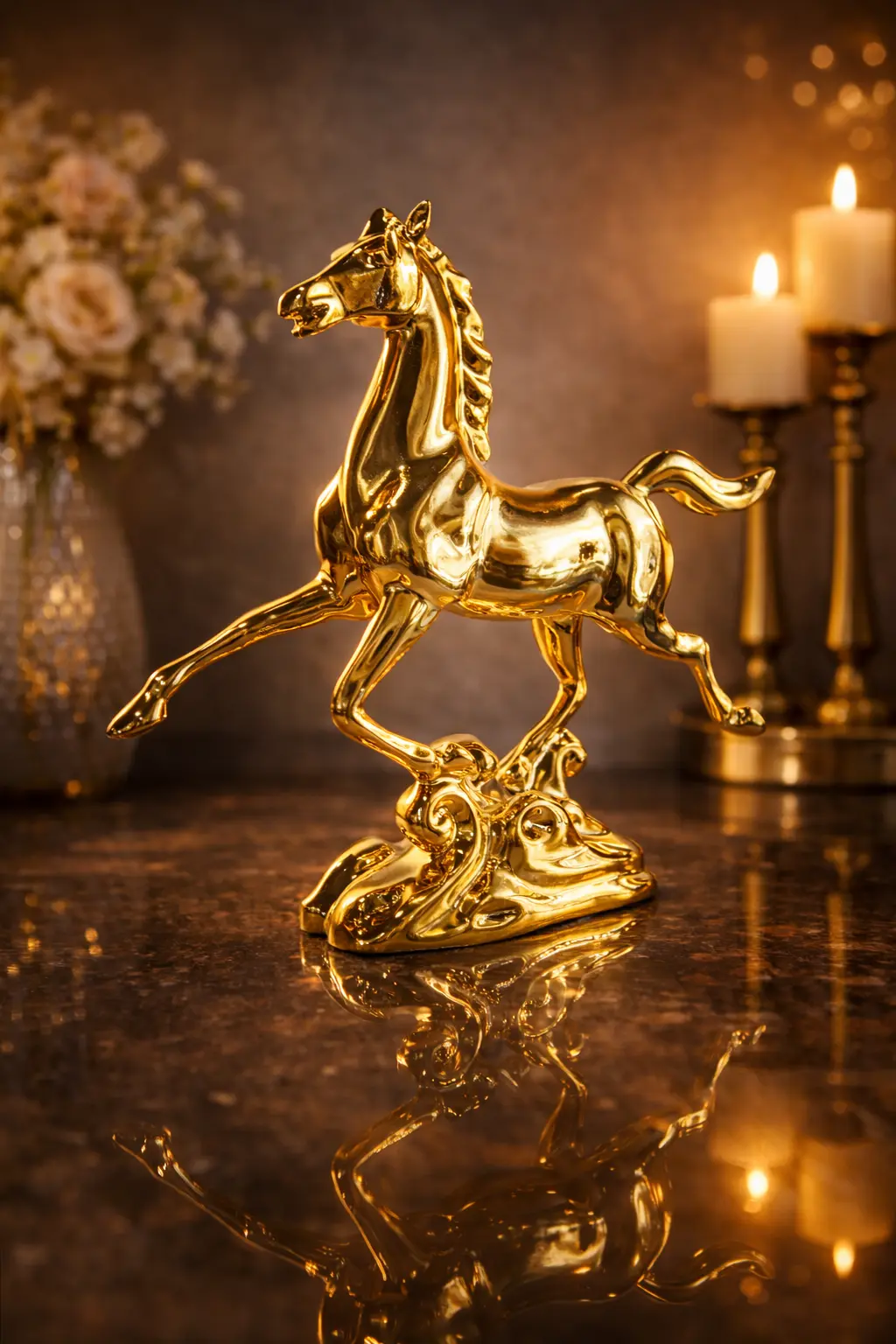 Add a touch of luxury and dynamic elegance to your interiors with this Golden Horse Showpiece. Crafted from durable polyresin and finished with premium golden electroplating, this striking sculpture symbolizes strength, success, and forward movement.