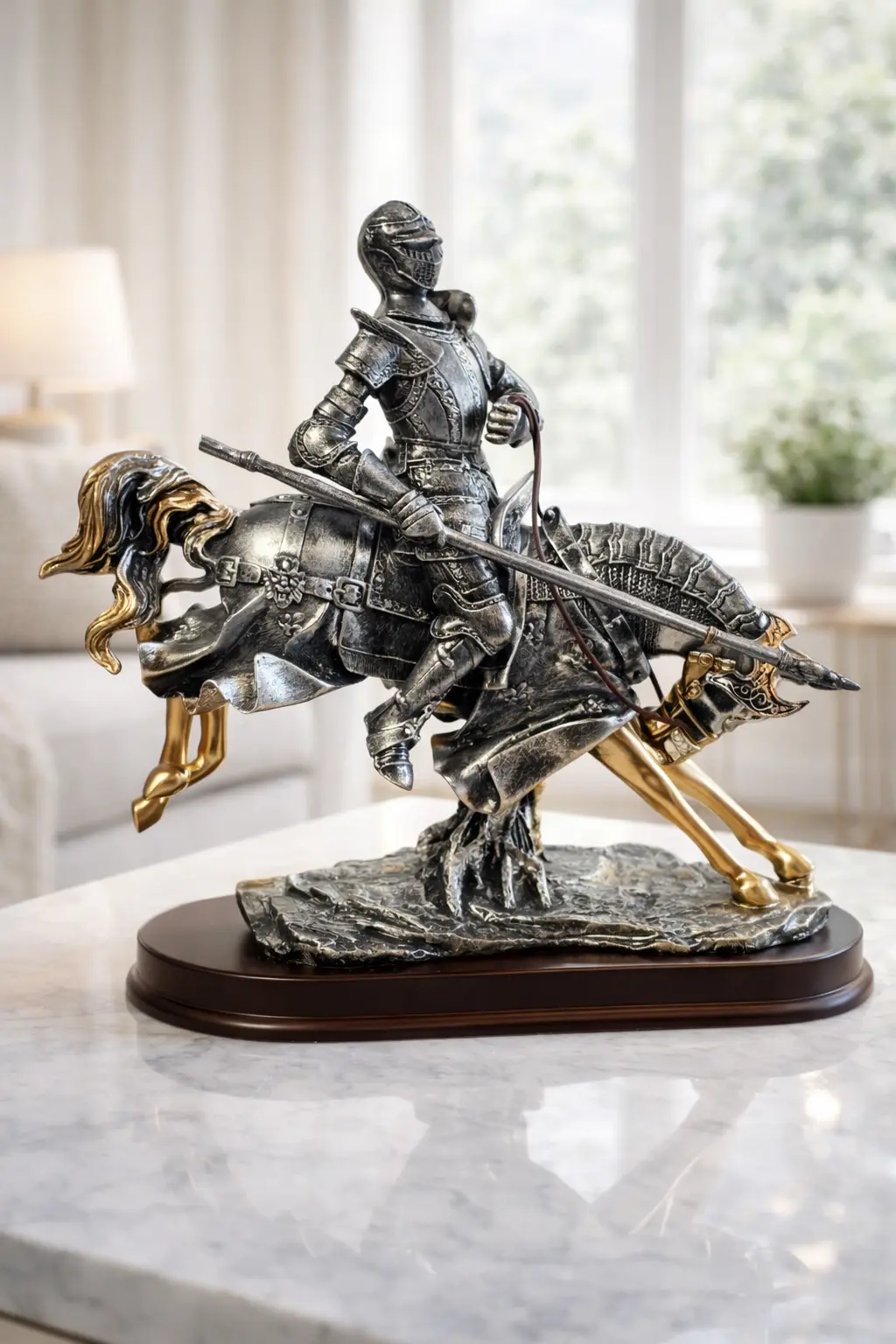 This impressive showpiece features a brave knight riding a galloping horse, beautifully crafted from durable polyresin. The sculpture is finished in a metallic silver tone with elegant gold accents on the horse’s legs, armor details, and decorative elements, giving it a classic and regal appearance.