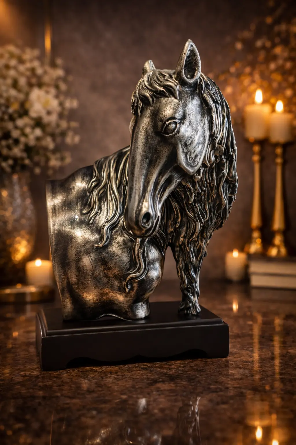 Bold, elegant, and full of character, this striking horse head sculpture is designed to make a statement in any interior. Finished in a rich antique metallic tone with dark silver and bronze highlights, the piece beautifully captures the texture of the flowing mane and the noble expression of the horse. The side-profile pose with a slightly lowered head gives the sculpture a powerful yet graceful presence.
