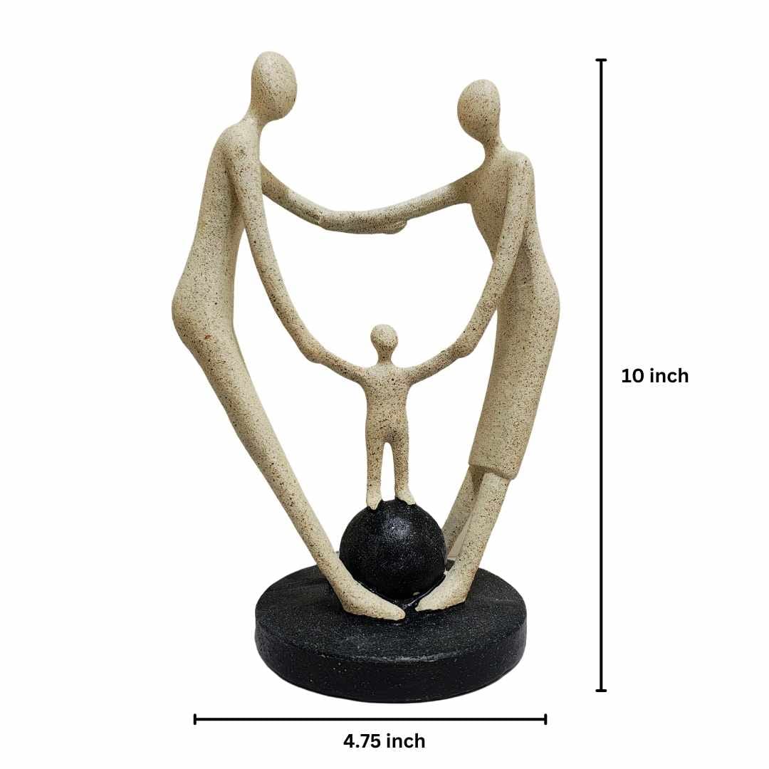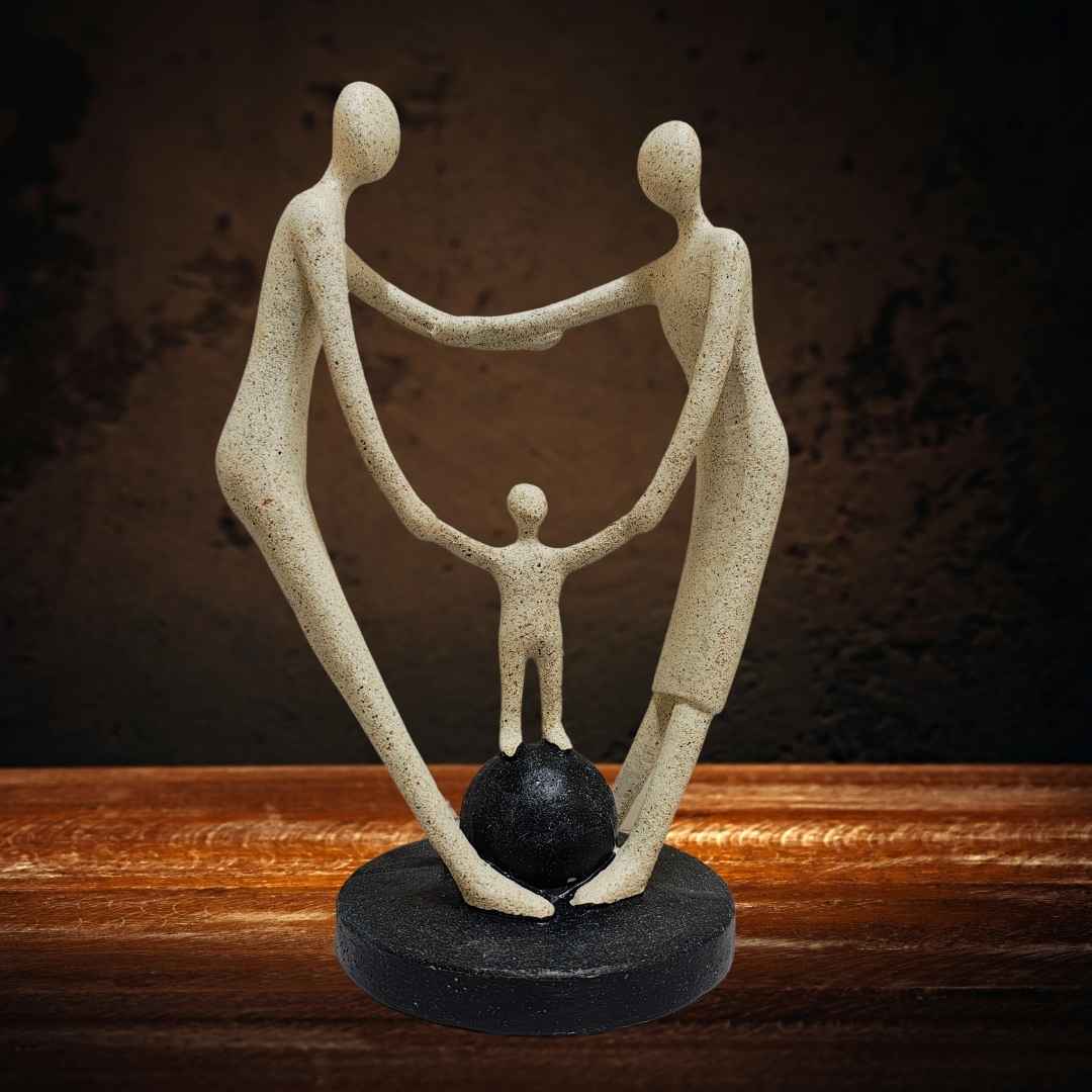Featuring a joyous family of three, this charming sculpture showcases a mother, father, and child. The parents are elegantly depicted, holding each other with one hand while nurturing their child, who stands confidently in the center on a solid, sphere-like base, symbolizing stability and togetherness.