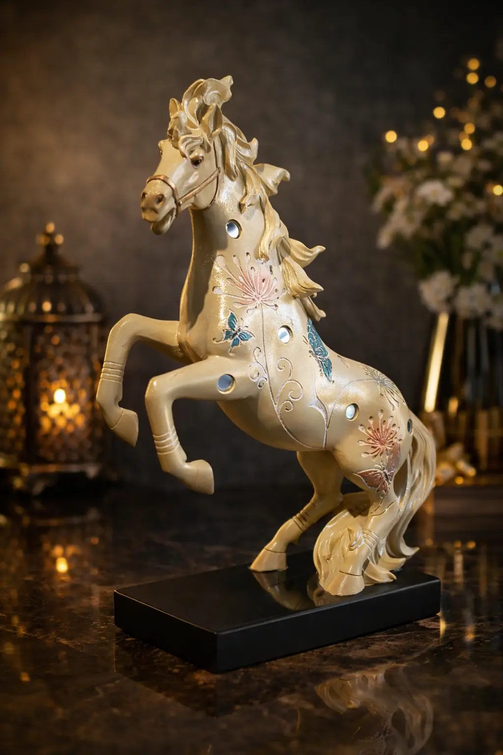This elegant rearing horse showpiece is crafted from durable polyresin and finished in a soft champagne-gold tone that gives it a graceful and luxurious appearance. The sculpture features delicate floral and butterfly patterns across the body, adding a touch of artistry and charm. The horse is captured in a dramatic rearing pose, with its front legs lifted and mane flowing, creating a sense of strength, motion, and vitality.